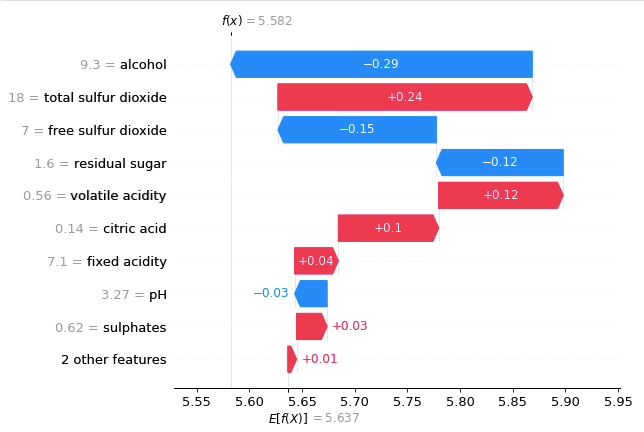 接下来,我们对测试集中的第二个观察样本进行同样的瀑布图分析。模型对该样本的最终预测值为 5.582。其推导过程如下:5.637 (基准值) + 0.01 + 0.03 – 0.03 + 0.04 + 0.1 + 0.12 – 0.12 – 0.15 + 0.24 (硫酸盐的正贡献) – 0.29 (酒精含量的负贡献) ≈ 5.582。