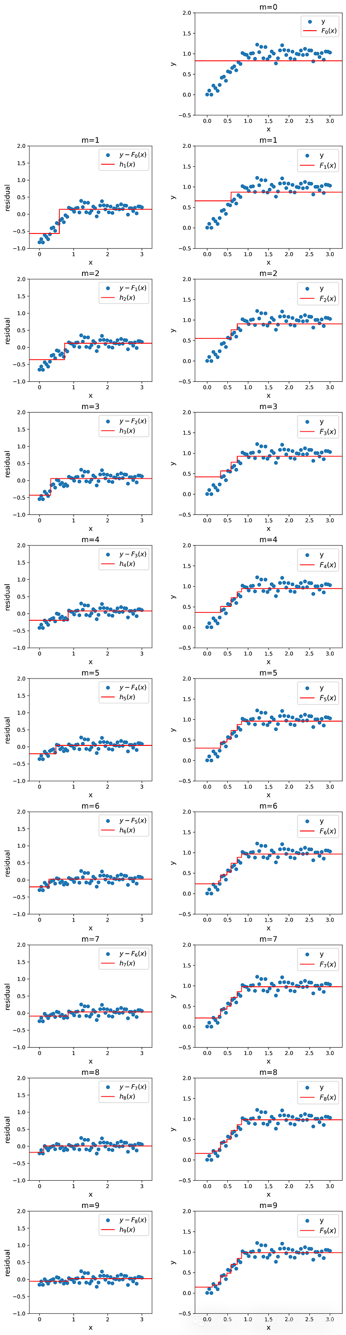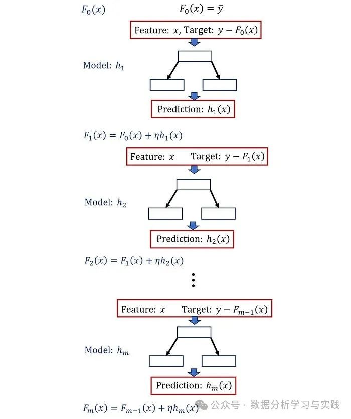 这个过程可以重复M次。每次我们根据之前的模型计算训练数据集的残差,并训练决策树 来预测这些残差。因此, 将 作为其特征,并将 作为其目标。这棵树的预测被添加到前一棵树的预测中以改进它: