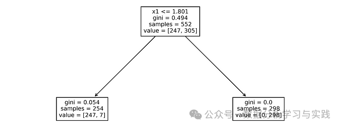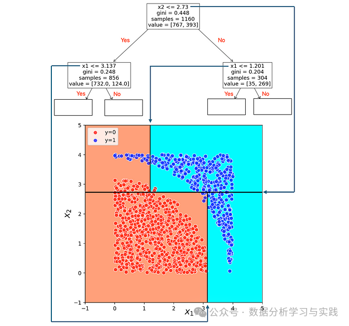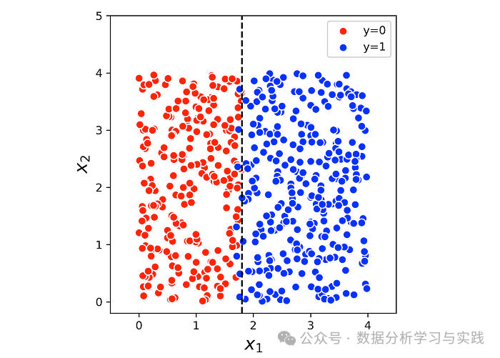 理想情况下,决策边界应分隔所有具有不同标签的数据点。因此,在决策边界产生的每个区域中,我们应该只有具有相同标签的数据点。如图 3 所示,根线对于我们的数据集来说不是一个好的分类器,因为在每个区域中我们都有 和 的数据点的混合。因此,决策树应该添加更多节点以提高分类的准确性。