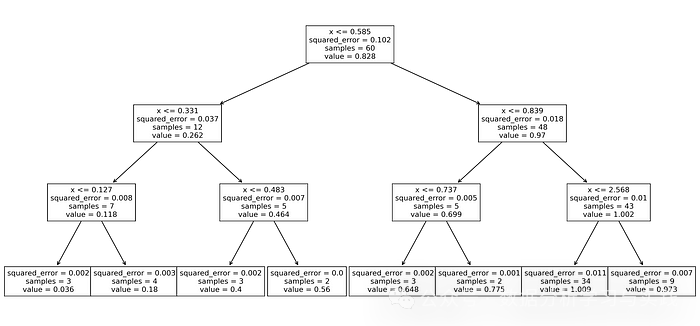 请注意,残差是使用概率而不是赔率的对数计算的。接下来,我们创建一个浅层决策树回归器来预测训练数据集的残差。该树回归器用 表示,以 作为特征,以 作为目标。训练树回归器后,我们需要修改其叶子的值。对于树中的每个叶子(用 表示),我们将叶子 ( ) 的值更改为: