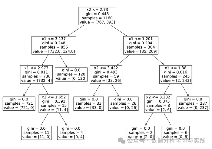 接下来,我们使用 Scikit-learn 库在此数据集上创建并训练一个决策树分类器。拟合模型后,我们可以使用 plot_tree() 函数可视化决策树。结果树如图 2 所示。