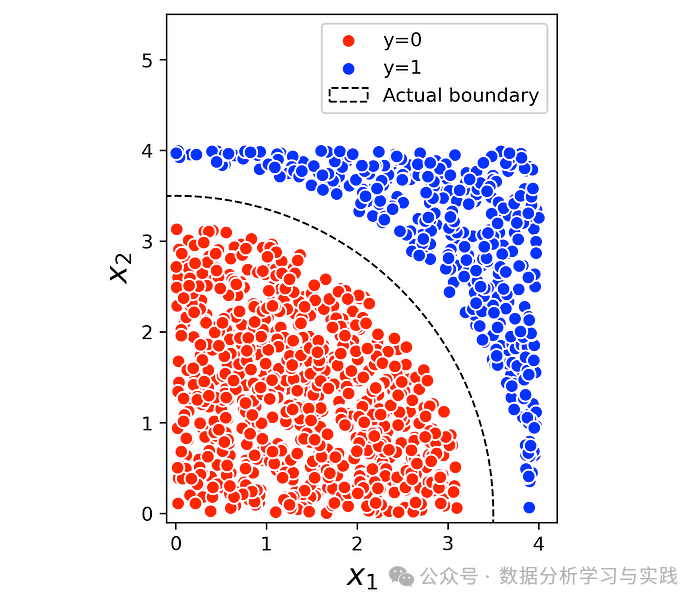y = (X[:, 0]**2 + X[:, 1]**2 >= high_r).astype(int) #转化为 0,1