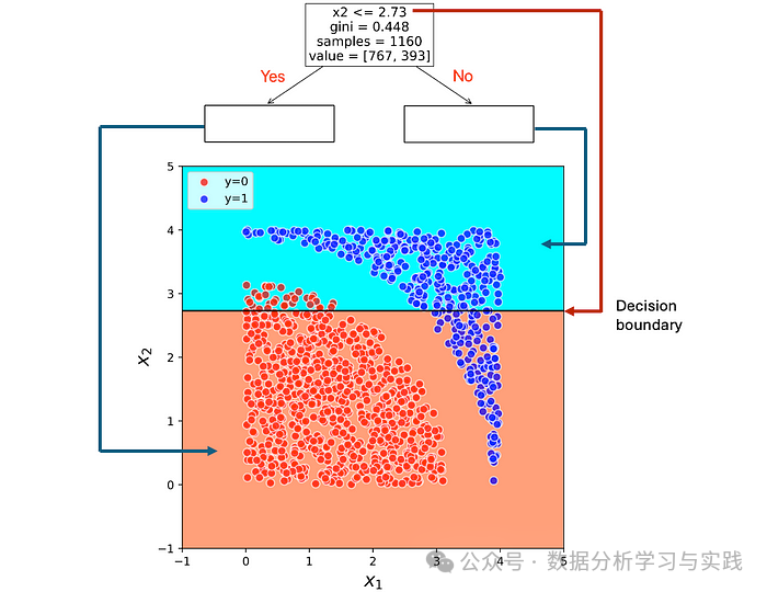 此决策树用于对数据点进行分类。我们将数据点传递给它,它能够确定其标签 ( 或 )。这是通过将数据点的特征值传递给决策树来完成判定的。假设我们想使用图 2 中的决策树来确定数据点 ( , ) 的标签。让我们仔细看看根节点。根节点将特征 的值与一个阈值进行比较,这里的阈值为 2.73。如果 ≤2.73,我们转到左子节点。否则,我们转到右子节点。因此,根节点通过直线 =2.73 将特征空间划分为两个区域,该直线是使用阈值定义的。在一个区域中我们有 ≤2.73,在另一个区域中我们有 >2.73。如果我们将根视为一个简单的分类器,则这条线充当决策边界。如图 3 所示。