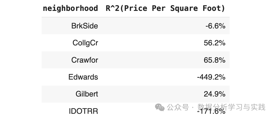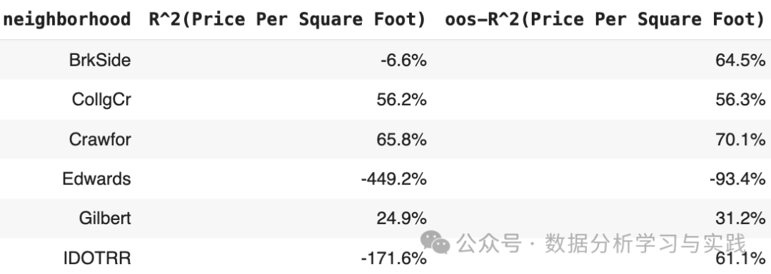表中只显示了 6 个小区,但如果我们把所有小区都计算在内,并计算它们的加权平均值(权重由每组中的房屋数量决定),我们会发现平均 _R 平方为 -86.7%。