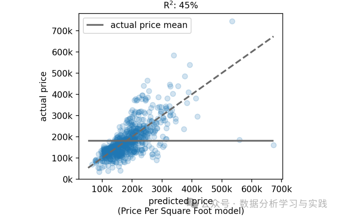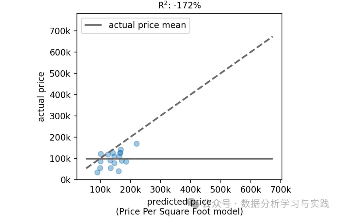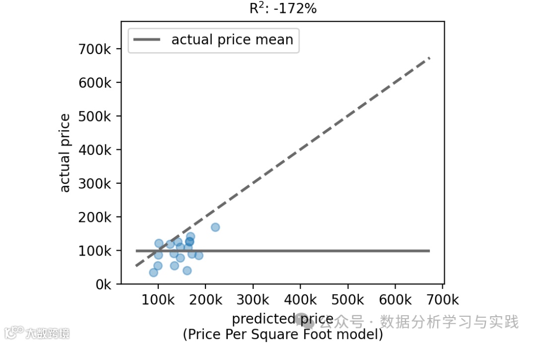 不是因为 “每平方英尺价格 ”模型很差,而是因为非熟练模型太好。非熟练模型预测的是目标变量的平均值。由于所有价格都在一个小区间内,非熟练预测接近所有点,因此其 MSE 非常小,是一个非常好的模型。