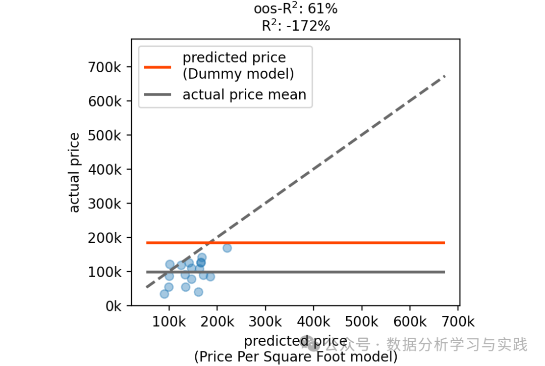 现在我们的模型(Price-Per-Square-Foot)和 Dummy 模型打得旗鼓相当。虽然 R-方 非常糟糕(-172%),但 oos-R-Squared 跃升至 61%。