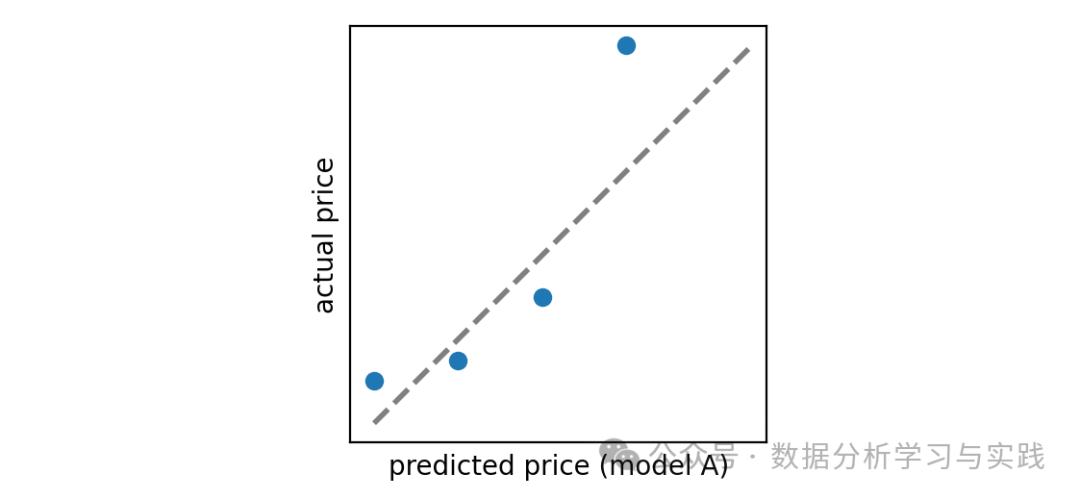 假设我们的测试集由四栋房子组成。我们可以通过绘制这四栋房子的曲线(预测价格在 x -轴上,实际价格在 y -轴上)来直观地检查该模型的表现: