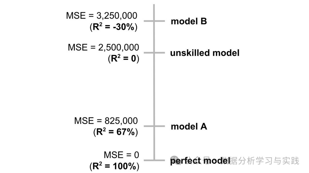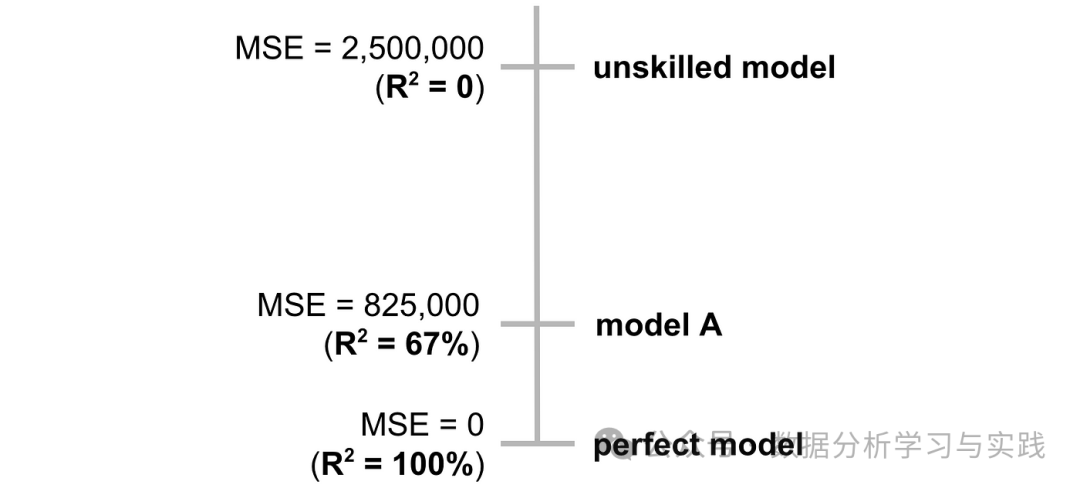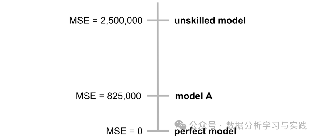 R-方 背后的理念是在完美模型和非熟练模型之间线性缩放模型的 MSE。由于完美模型的 MSE 为 0,因此公式简化为: