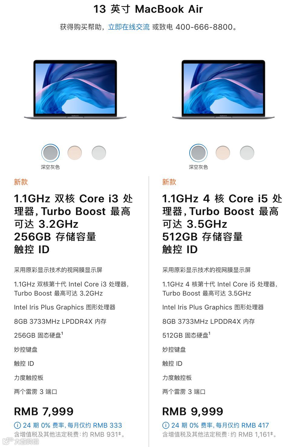 价格方面,新款13英寸 MacBook Air国行价格:①1.1GHz 双核第十代 Intel Core i3 处理器、256GB 固态硬盘版 7999 元起售;②搭载1.1GHz 4 核第十代 Intel Core i5 处理器、512GB 固态硬盘版 9999 元起售,具体开卖时间尚未公布。