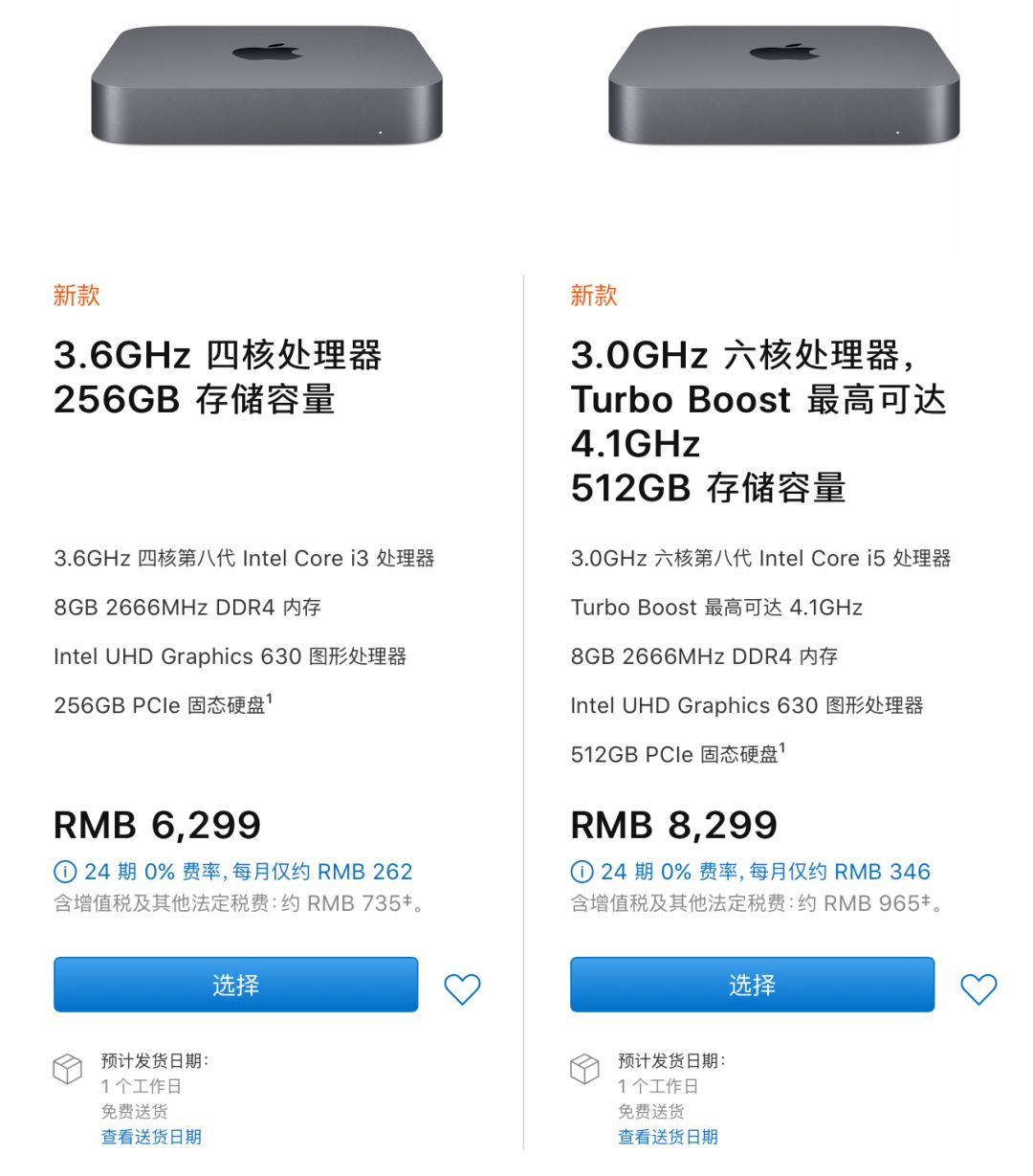 价格上,新款Mac mini 256GB固态硬盘存储空间 售价 6299 元,512GB固态硬盘存储空间 售价 8299 元,官网现在就可以购买。(其也是苹果昨晚发布的硬件类新品中唯一一款可以直接购买的~)