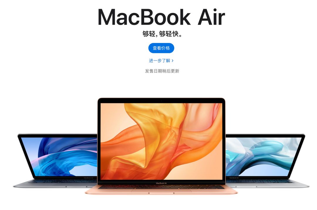 然后是新款13英寸 MacBook Air,其配置主要升级有:第十代英特尔酷睿处理器(较上代性能提升两倍,图形处理速度提高80%),剪刀脚键盘 ,可选择储存空间更大等。