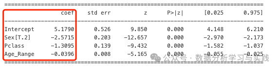 sex:最后,注意到性别变量的负系数非常大,为-2.5715。在沉没的泰坦尼克号上,与女性乘客相比,男性乘客的生存机会相当悲惨。在保持Pclass和年龄不变的情况下,男性乘客的生存几率仅为女性乘客的exp(-2.5715) = 7%。