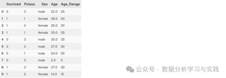 我们得到以下输出。注意我们添加的新Age_Range列: