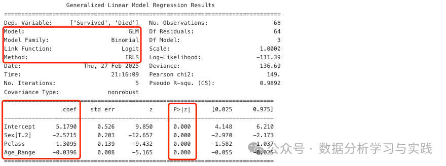 在上面的输出中,statsmodels告诉我们,它已经训练了一个二项式的广义线性模型,因为,我们要求它这样做,它使用了对数链接函数,并且它使用了迭代重加权最小二乘法(IRLS)算法来训练我们的模型。