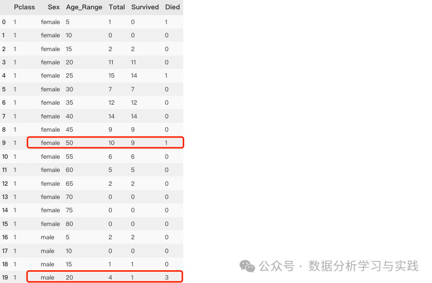 在第19行,我们看到有4名年龄在15-20岁的男性乘客,其中只有一人幸存下来。