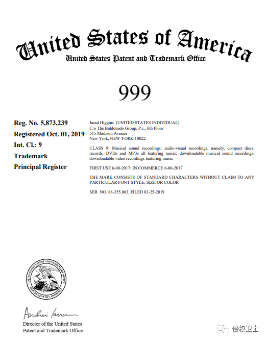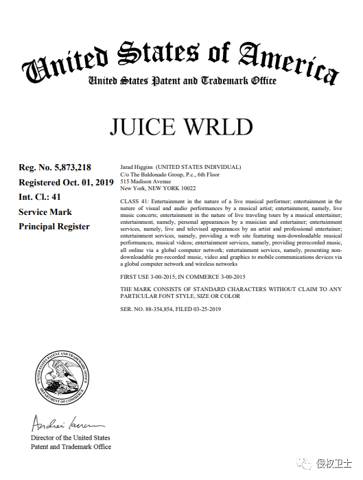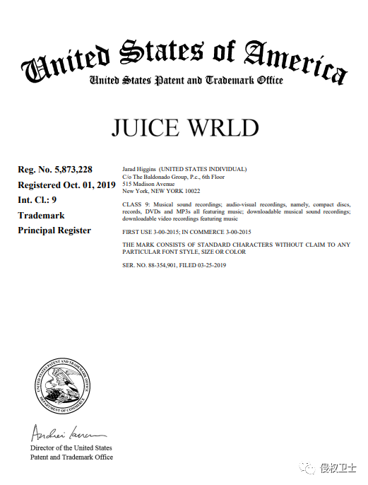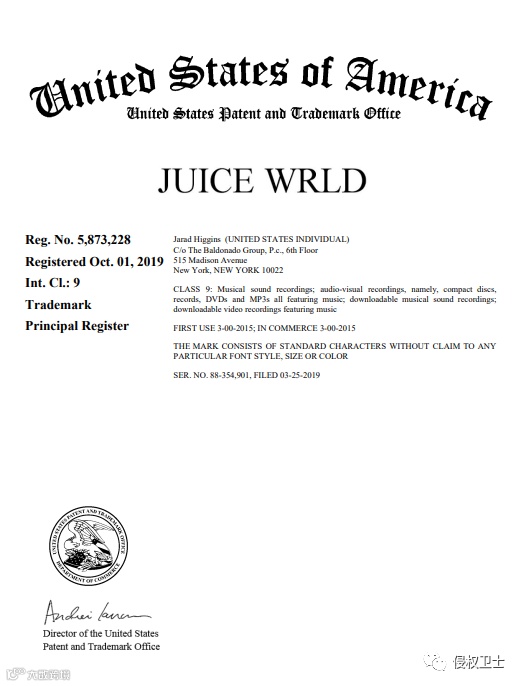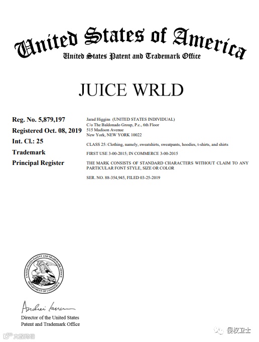 Juice WRLD起诉的相关注册商标、版权专利证书如下, 卖家可自行比对核查: