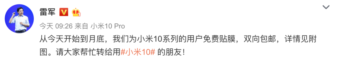 雷军宣布,从今天开始到月底,将为小米10/小米10 Pro用户提供免费贴膜的服务,双向包邮。要知道曲面屏一向不好买到合适的膜,这也算非常贴心的服务了~