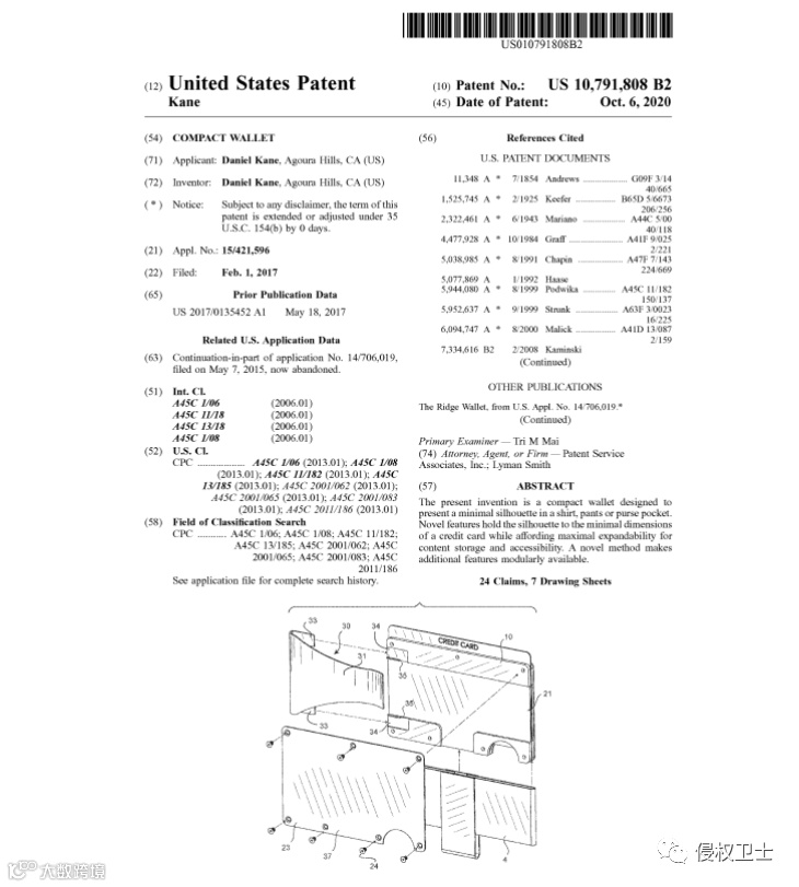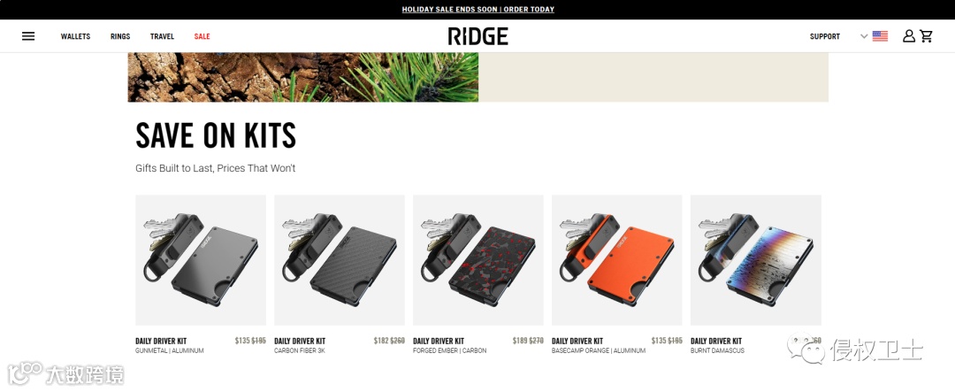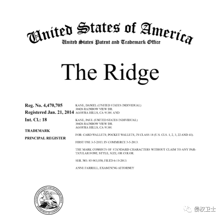 本月初,一款钱包品牌The Ridge的持有人THE RIDGE WALLET LLC于5日提起一件侵权诉讼案,主要是其品牌名下一款同时注册了商标、专利、版权钱包被抄袭,假冒,未获授权公开销售,其委托美国知识产权律所Sciplaw发起维权起诉,案件号23-cv-16498。