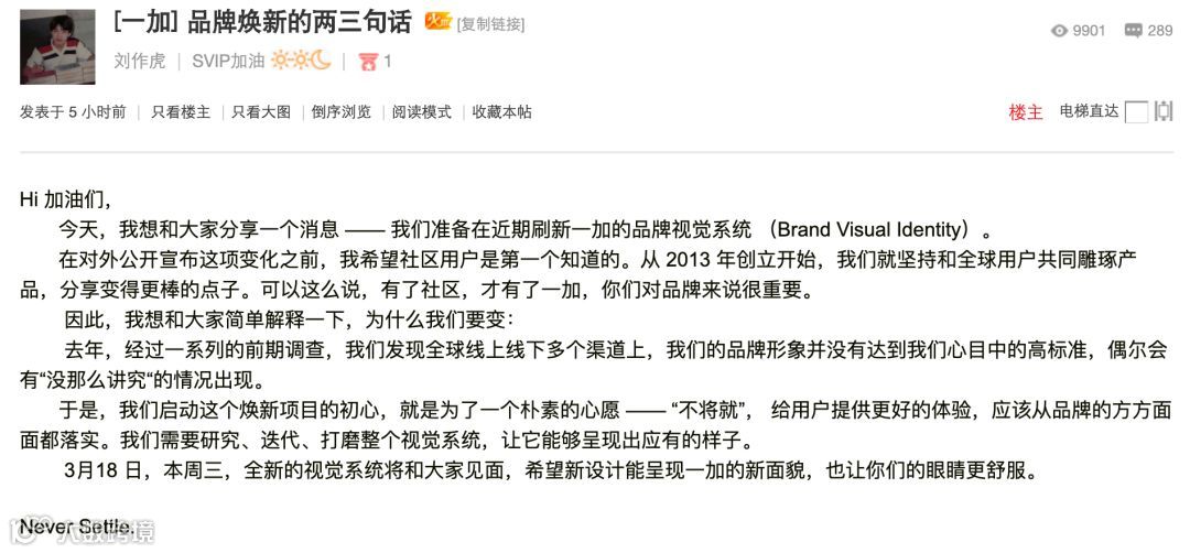 一加手机创始人刘作虎在论坛表示,将在近期更新一加的品牌视觉系统,3月18日周三和大家见面。由于去年调查发现一加的品牌形象没有达到心目中的高标准,偶尔会有“没那么讲究“的情况出现。为了“不将就”...研究、迭代、打磨整个视觉系统...希望新设计能呈现一加的新面貌,也让大家的眼睛更舒服。