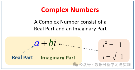 同样,虚数可以用与实数相同的代数规则进行加法和乘法运算。我们甚至可以将一个虚数与一个实数相加,得到一个所谓的复数。加法中使用的实数构成复数的 “实部”,而虚数构成 “虚部”。