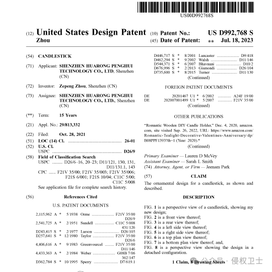 本月4日,Huarong Penghui(深圳)公司委托Getech代理专利侵权案,涉事产品是一款爱心烛台,案件号24-cv-1798。