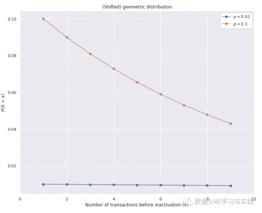 每个存活的概率是(1-p)。请注意,根据定义,一个客户在流失前必须至少进行过一次交易(否则他一开始就不会成为我们的客户!)。