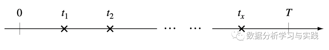 让我们把它变得更加具体。假设我们目前处于时间 T ,我们正在回顾一个特定客户的历史交易,该客户的购买率为𝜆。他的第一笔交易发生在 ,最后一笔交易发生在 。这些时间点画在时间轴上,看起来像这样。