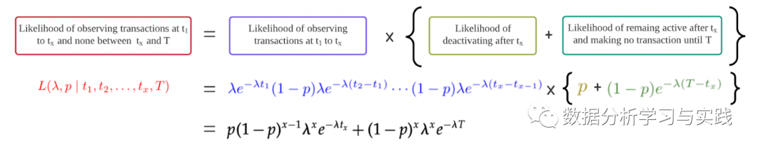 上述定义的可能性公式适用于在观察期内进行了那些购买的客户。由于我们假设所有的客户一开始都是活跃的,所以客户在时间[0, T]之间不进行任何购买的可能性是标准的指数函数。