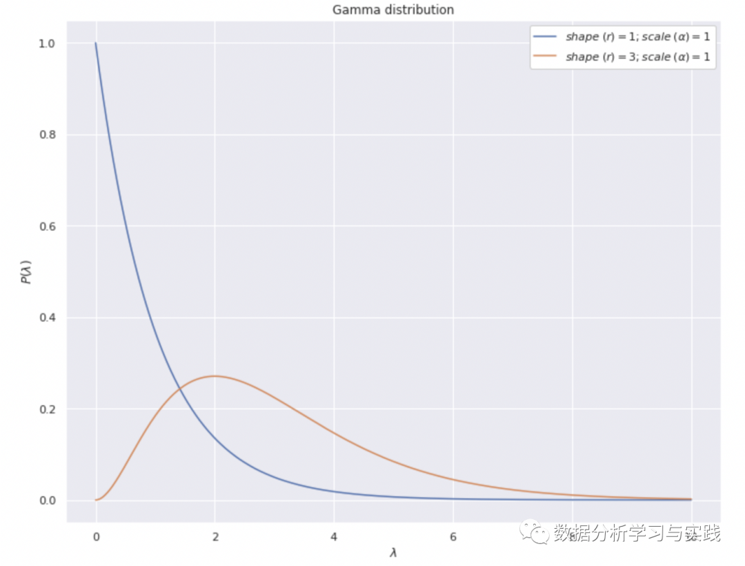 Gamma分布符合所有这些条件,是BG-NBD中用来模拟𝜆的一种。它的参数是形状参数 r 和尺度参数α;这两个参数的不同组合导致Gamma分布具有不同的形状。下面是Gamma分布的PDF:
