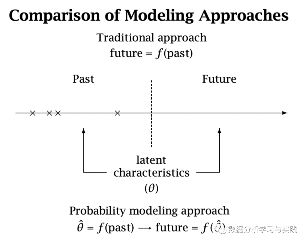 另一方面,BG-NBD模型是一个概率模型 。在概率模型中,我们假设我们的观察(即交易)是由一个物理过程产生的,我们可以用概率分布来建模。我们的任务是估计能够最好地解释我们现有观察结果的参数。一个常用的办法是找到这些参数的最大似然估计值。然后我们可以使用这些估计的参数来进行未来的预测。与第一种相比,这种概率框架通常更加稳健、准确、可解释。