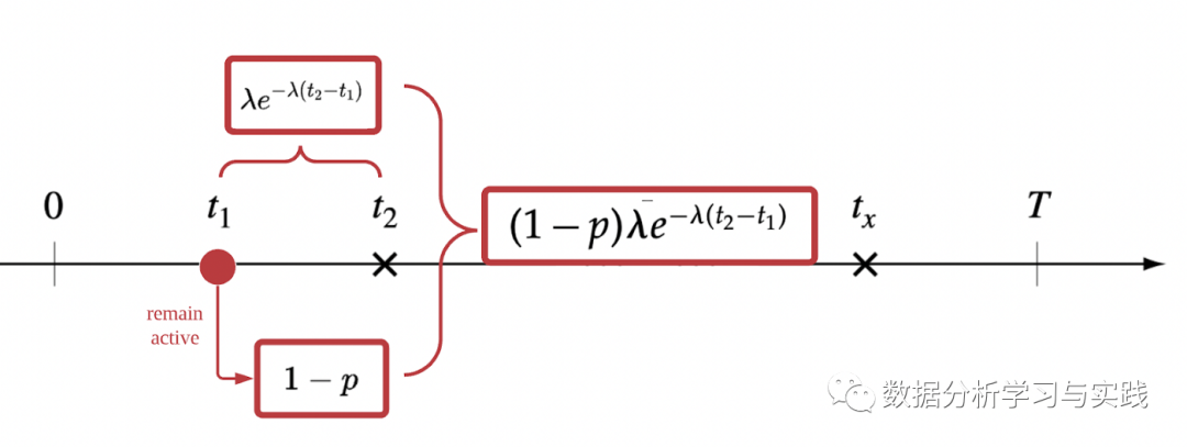 第二笔交易在 发生的可能性是客户在 之后仍然活跃的概率(1-p)乘以标准指数可能性分量。