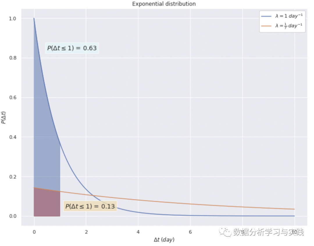 上图显示了与两个顾客相关的两个指数分布的PDF。第一位顾客(蓝色曲线)一般每天买一个蛋糕(他的购买率𝜆为1个蛋糕/天)。他的下一次购买是在当前购买的一天之内发生的概率,可以通过取蓝色曲线下0和1之间的面积,计算出0.63。