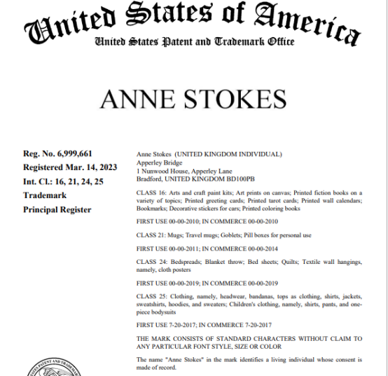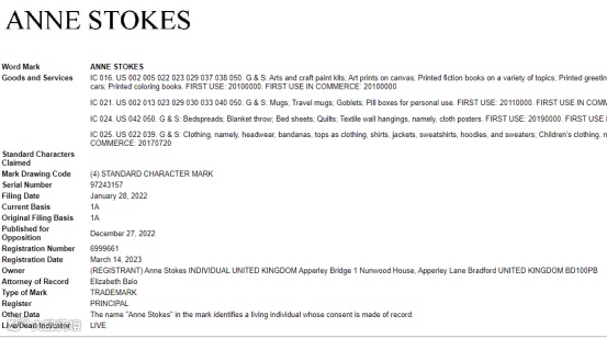 ANNE STOKES注册的类目主要集中在: