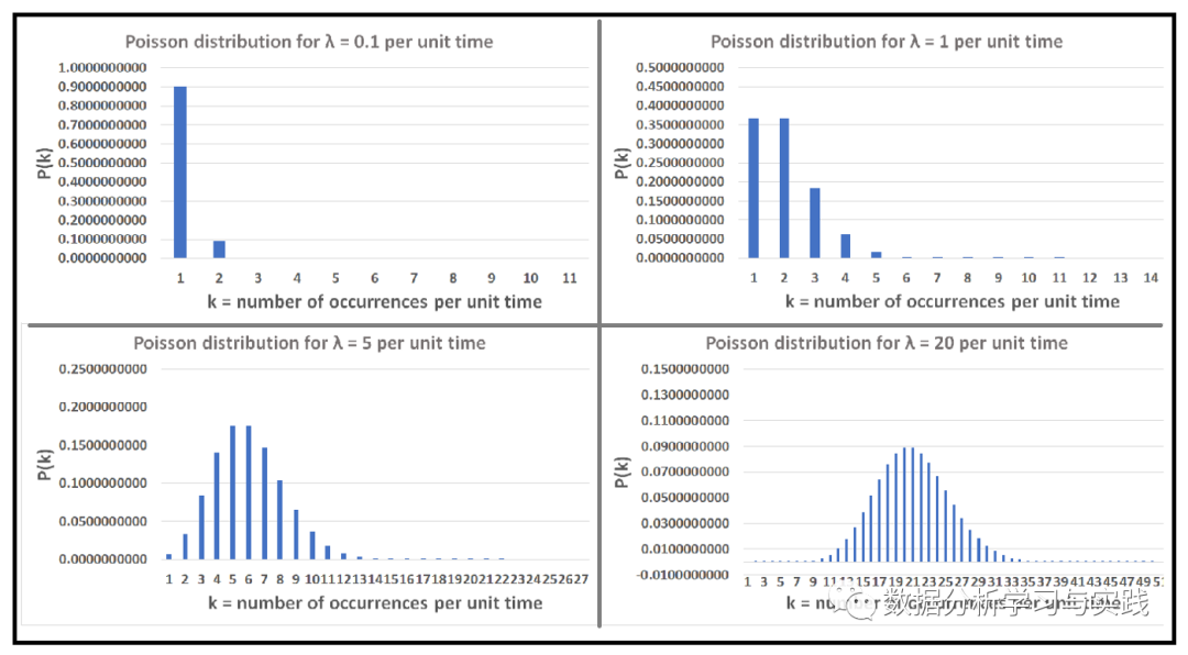 上述公式给我们提供了在单位时间内发生 事件的概率,给定的平均发生率为λ事件/每单位时间。