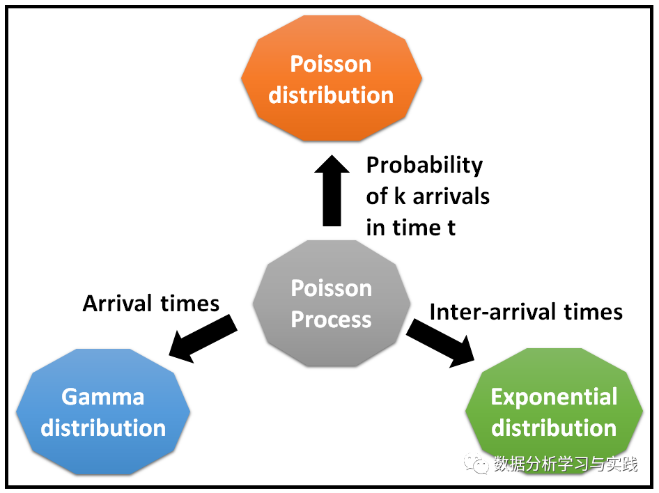 下面的示意图总结了构成泊松过程的三个主要分布: