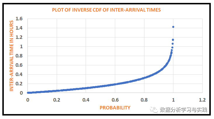 我们现在有足够的信息来生成泊松过程中的到达间隔时间。我们通过使用逆向变换取样技术来做到这一点,在该技术中,我们构建了CDF的反函数,并从 Uniform(0,1)分布中输入不同的概率值。这样我们就可以得到相应的概率的到达时间。