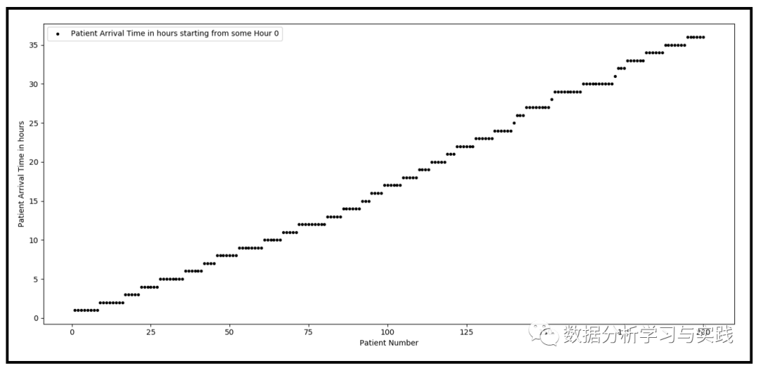 上图描述了一家医院急诊室的病人到达时间。可以看出横轴是病人累积数量,纵轴是病人的到达时间时间,单位为小时(从任意时间点开始计时)