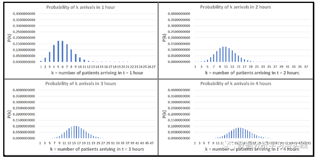 为了知道 病人在 小时内走进急诊室的可能性,我们将其建模为具有速率( )的泊松过程。在时间 中发生 次的PMF的相应公式是如下: