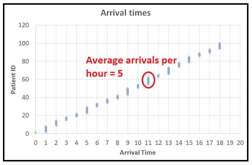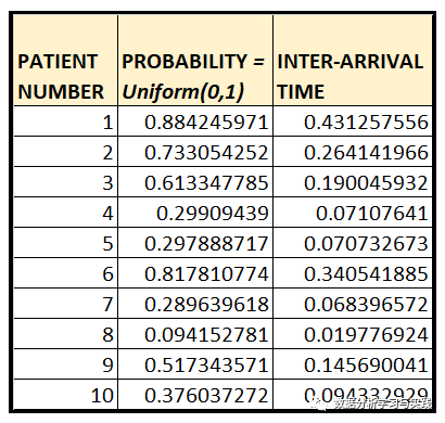 现在,以下是前10名病人在急诊室的到达时间(以小时为单位)的表格。我们使用上述公式生成了这个日期,λ设置为每小时5个病人。