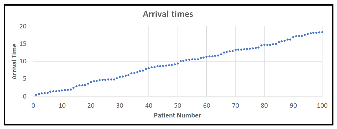现在我们知道了如何产生到达间歇时间,就很容易产生病人的到达时间。