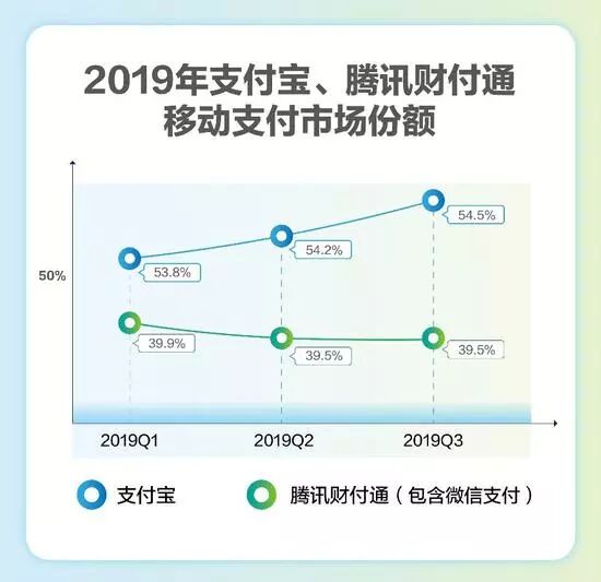 对比3个季度的数据,可以看到 支付宝 一直都在上涨,而腾讯财付通(含微信支付)略有一丢丢0.5的下滑。至于整体市场情况,2019年Q3中国第三方移动支付交易规模为56万亿元,同比增速为15.2%。