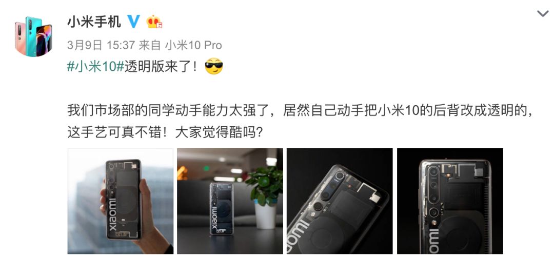 小米手机官博近日表示一位小米市场部的员工自己动手把小米10的后背改成了透明的,其还结合之前小米推出的多彩手机壳,在改制透明机身后还加上了小米的logo。
