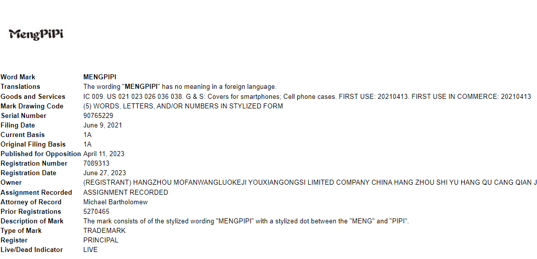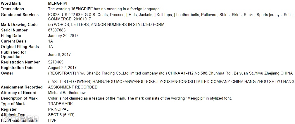 原告是国内浙江杭州的一家服装公司,本案维权的商标是该公司旗下的Mengpipi商标。原告公司主要销售女性服装,包括但不限于外套、T恤、连衣裙等产品。