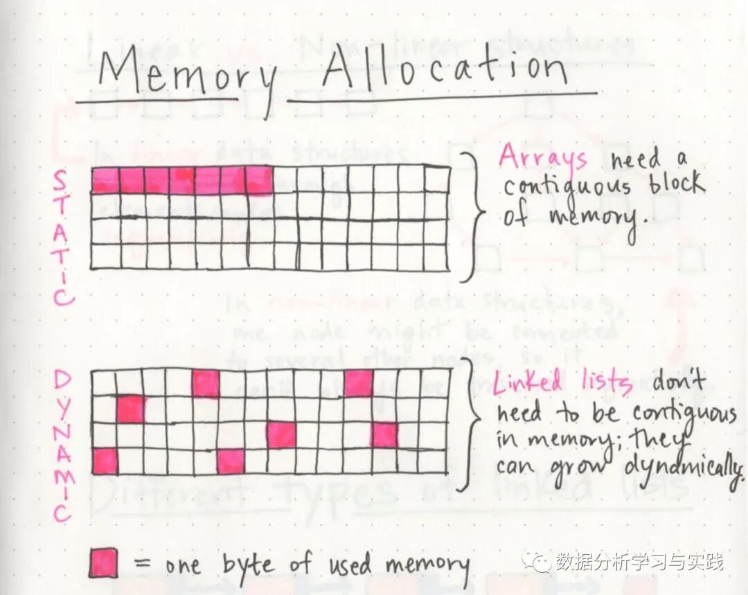 另一方面,当一个链表诞生时,它不需要7个字节的内存都在一个地方。一个字节可以在某个地方,而下一个字节可以完全存储在内存的另一个地方!这就是链接列表。链接列表不需要占用单一的内存块;相反,它所使用的内存可以分散在各个地方。