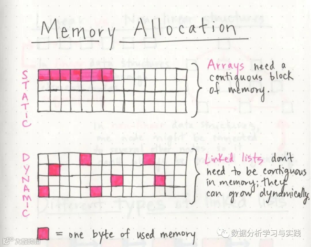 阵列和链表的根本区别在于,数组是静态数据结构,而链表是动态数据结构。静态数据结构需要在结构创建时分配所有的资源;这意味着即使结构的大小增加或缩小,元素被添加或删除,需要事先给定的大小和内存量。如果需要向静态数据结构添加更多的元素,而它没有足够的内存,你需要复制该数组的数据,然后用更多的内存重新创建它,以便可以向它添加元素。