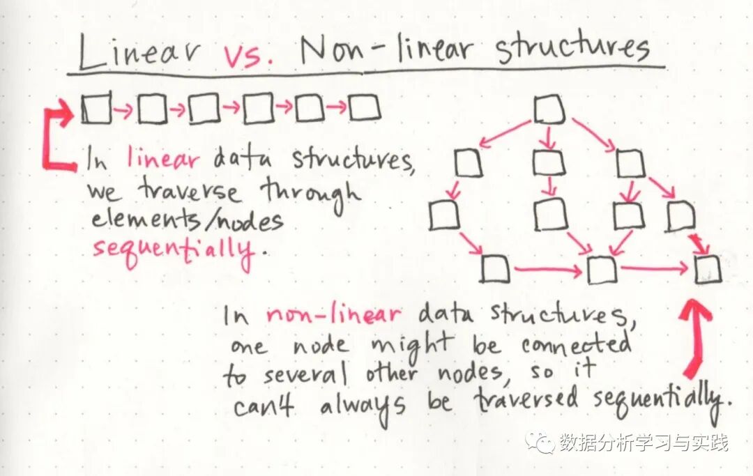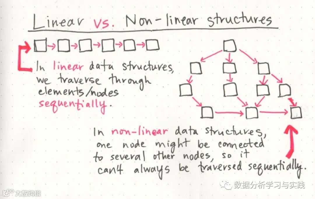 链接列表的一个特点它属于线性数据结构,这意味着它们的构建和遍历遵循一个顺序。我们可以把线性数据结构想象成:为了到达列表的末尾,我们必须按顺序穿过列表中的所有组件(items)。然而,非线性结构与线性结构恰恰相反。在非线性数据结构中 ,组件(item)不必按顺序排列,这意味着我们访问时可以不按顺序遍历数据结构。
