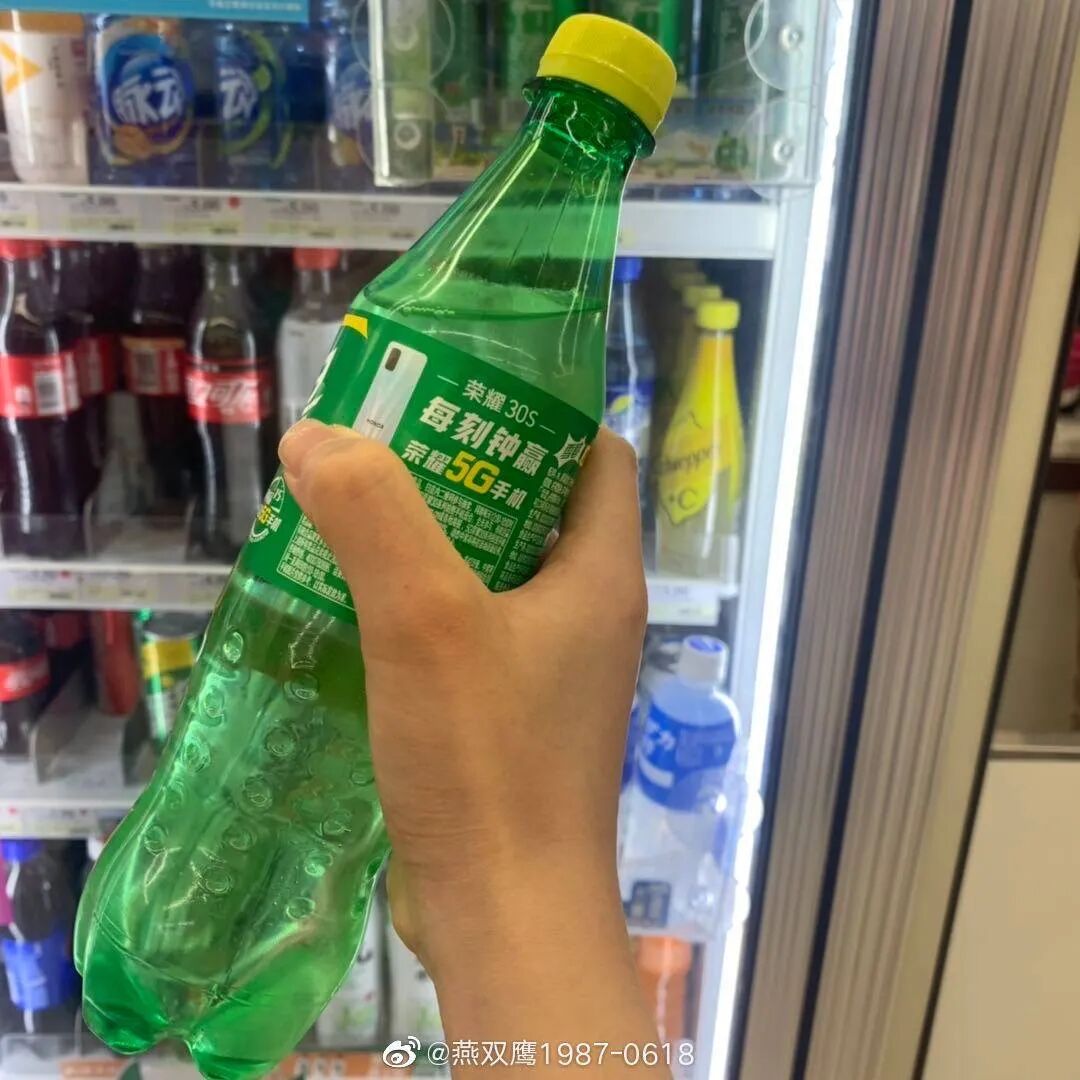 如上图所示,有网友爆料,在超市购买雪碧,发现雪碧瓶身的新包装上印有荣耀30S的相关活动,隐约可以看到