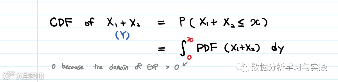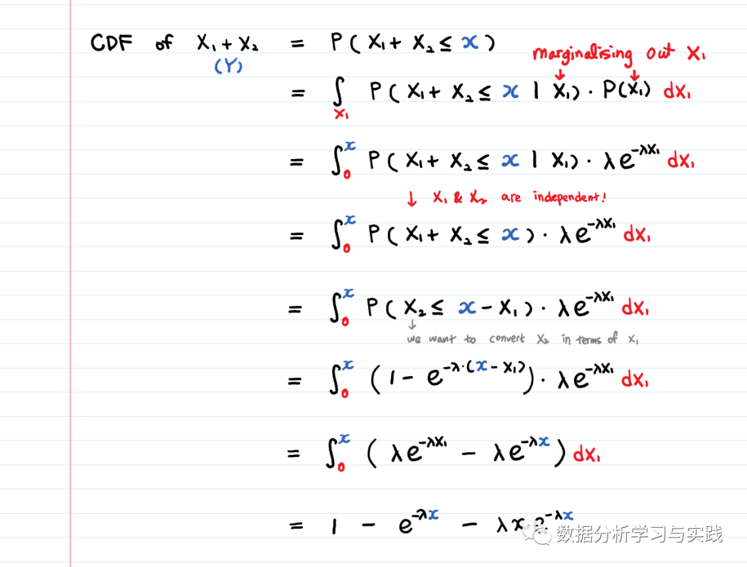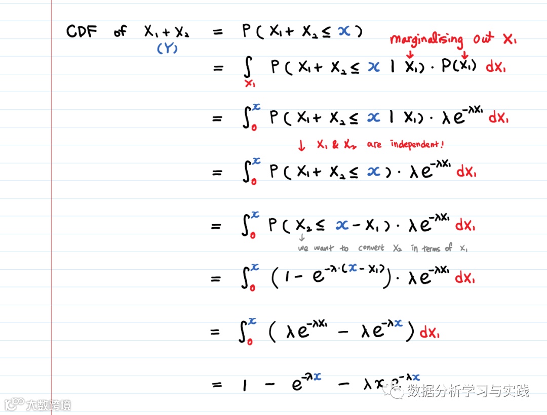 X1和X2是比率为λ的独立指数随机变量。X1〜exp(λ) X2〜exp(λ) 令Y = X1 + X2。问题:Y的PDF是什么?我们在场景下适用Y的分布?