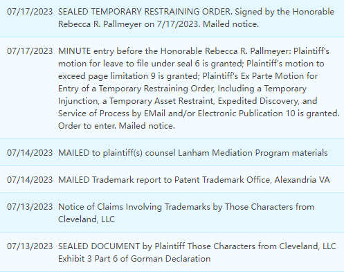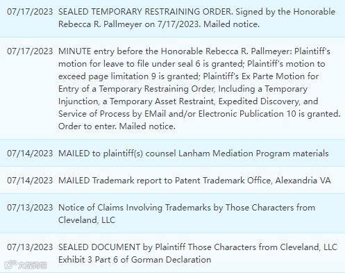 本案件于美国当地时间7.13立案,代理律所HSP代替原告已向地方法院起诉商标侵权,单方面申请进入临时限制令。现已于17日批准TRO冻结生效,批准内容包含临时强制令、临时资产限制、快速发现以及通过电子邮件和/或电子出版物送达法律文件的动议。原告通过邮寄通知,在15天后会申请初步禁令,已经收到TRO邮件的卖家抓紧时间处理侵权诉讼。