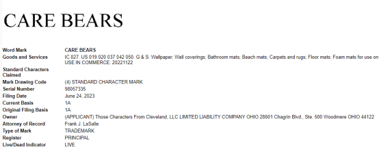 Those Characters from Cleveland, LLC是来自美国的一家品牌创意娱乐公司,旗下拥有Care Bears,Madballs,Holly Hobbie等多个知名品牌,其中Care Bears自系列动画片的诞生以来便广泛受到大小动画迷的喜爱,其周边产品也因此迅速火遍全球。